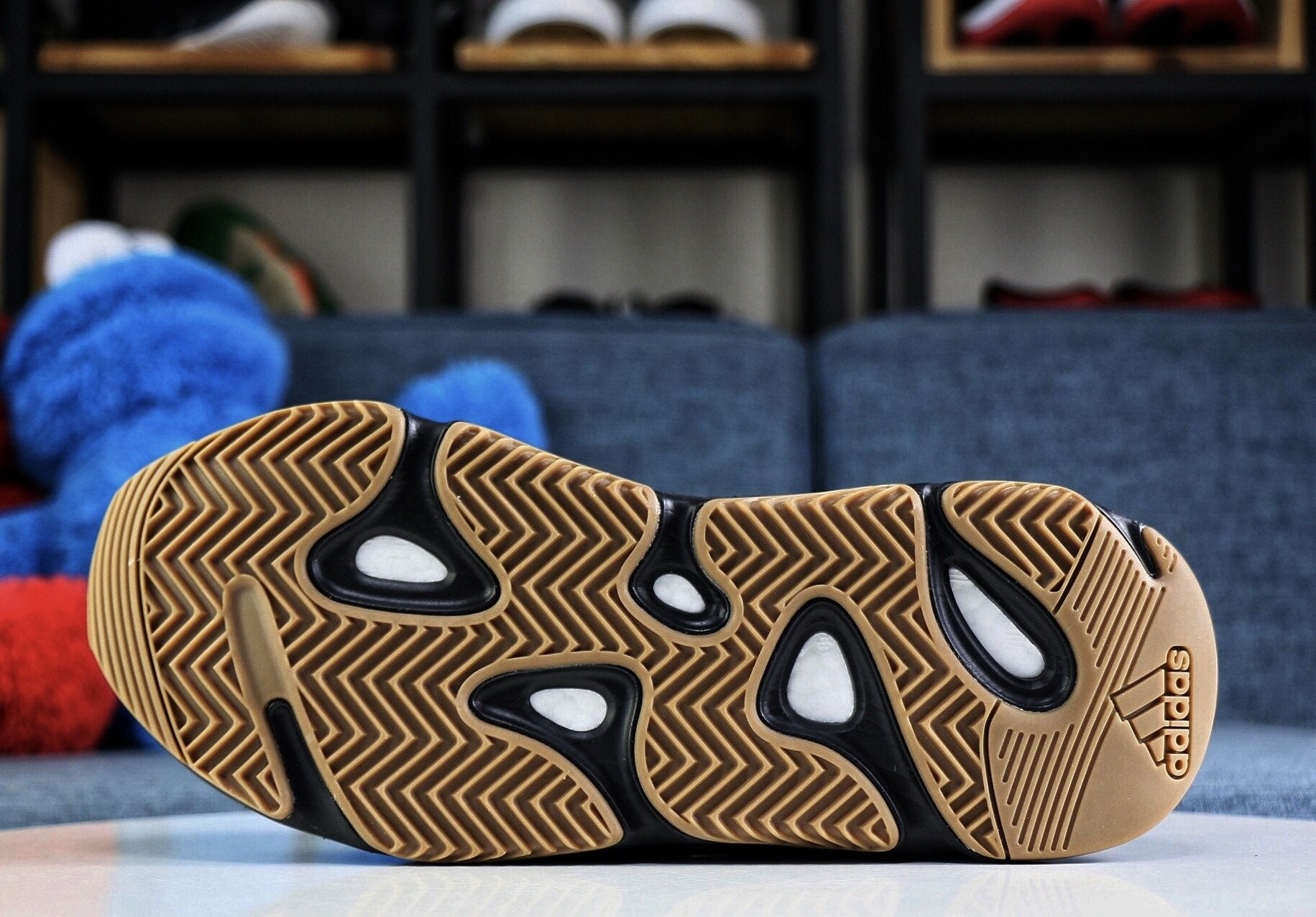 At the bottom, the Yeezy Boost 700's chunky midsole encapsulates adidas' revolutionary Boost cushioning in a full-length format, underscored by gum rubber tread.